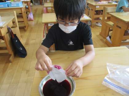 夏休み中に保管していたアサガオの花を水と一緒にもみこむと色水ができました。