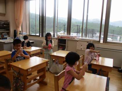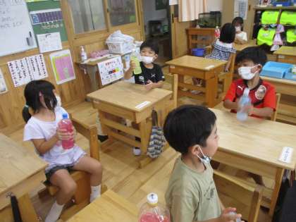 アサガオの花でできた色水に興味津々だった1年生ですが、今日は絵の具で色水を作ってみました。