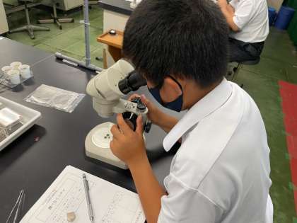 双眼顕微でお茶の葉をじっくりと観察しています。
