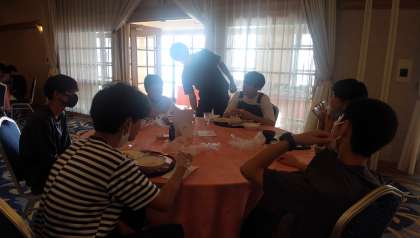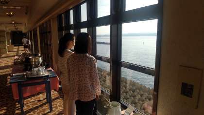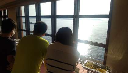 海を臨みながら、ビュッフェメニューを選んでいます。
