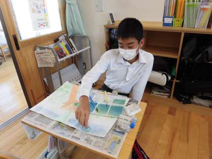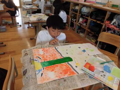 これまでに学習した技法を使って、色づけを工夫しています。水を含ませた絵の具をストローで吹いたり、歯ブラシに絵の具をつけてこすったり、水を多くふくませてティッシュペーパーでたたいたりと、自分のイメージを広げて表現することができました。