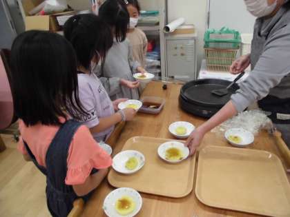 10月20日(木)のふるさと未来科の学習で、サツマイモ収穫祭をしました。前日に洗っておいたサツマイモをみんなで切ったりゆでたりつぶしたりして、最後はホットプレートで焼きました。サツマイモのおやきの完成です。京北サポート隊の方をお招きし、みんなで美味しくいただきました。