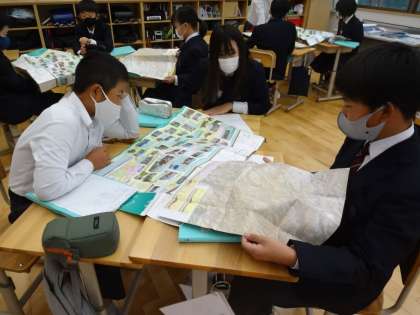 初めの授業では、京北の地図から歴史のものを探し、見つけたものを交流しながらグループ分けをしました。初は「自然系」や「建物系」とみんな言っていましたが、出し合った意見をよく見ると、それぞれの地域に分類できることに気がつきました。今後はグループに分かれて調べていく予定です。