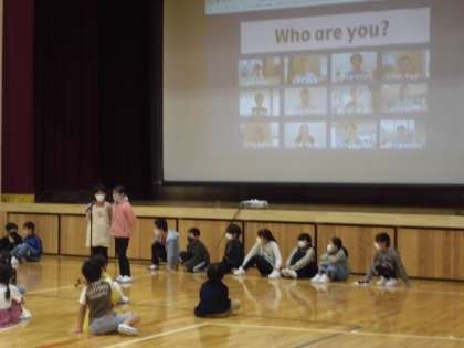 1stステージの朝会で3年生は外国語活動の発表をしました。