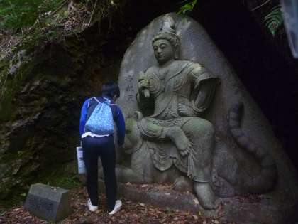 石仏を見つけました。ミッションカードの写真にある石仏を発見するたびに3年生の生徒は走っていき、「見つけた」と嬉しそうでした。