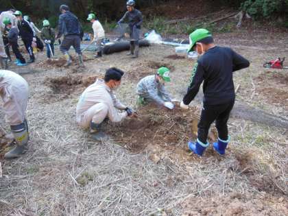 木の伐採の見学の後に、シャベルやつるはし、くわを使って穴を掘りました。穴を掘ったときに出てくる大きな石は,友達と協力して丁寧に取り除いていました。とちの木を植える際には、根っこを傷つけないよう、丁寧に作業をしていました。植えてすぐの苗は鹿に食べられてしまうことも多いので,獣害防止のネットをはりました。