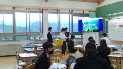 外国語科の学習で、各グループが英語でヒントを言い、どこの都道府県かを当てるゲームを授業でしました。ふりかえりには、「これまで学習したことを生かすと、簡単にヒントを作ることができた」や「英語でスラスラとヒントを言うことができた」など、活動を楽しんだ様子が書かれていました。