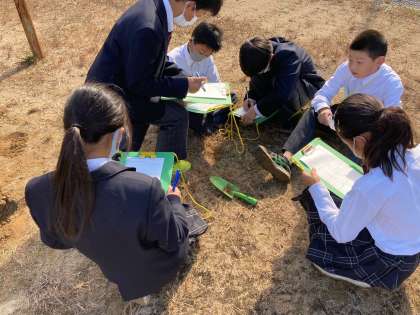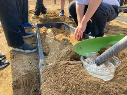 どうして雨が降った後の川の水はにごるのか調べるため、グラウンドの砂場を利用して実験を行いました。