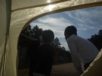 3人で力を合わせてテントやタープを組み立てています。