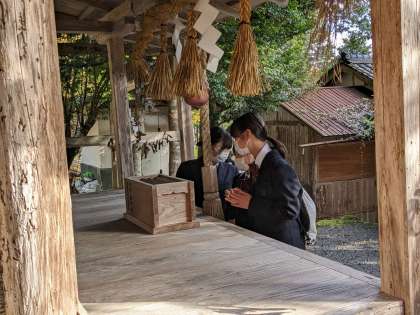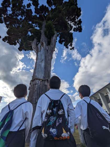 京北ふるさと未来科の学習では、地域の歴史について調べています。今回は、「弓削方面」に行って歴史のある建物等を見学してきました。まずは、「上中城址」へ行きました。建物こそありませんでしたが、広さを実際に歩いて感じている様子でした。また、「上中城址」についてかかれた看板もあり、その看板にかかれていることと照らし合わせながら辺りを見渡していました。次に、元京北第三小学校付近にバスを止め、「八幡宮社のご神木」を見に行きました。遠くから見るよりも、真下から見上げることで、大きさを実感していました。最後に「八幡宮社」へ行きました。敷地内をぐるぐる回って、どんなものがあるのか興味深そうに見ていました。
