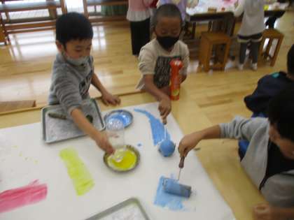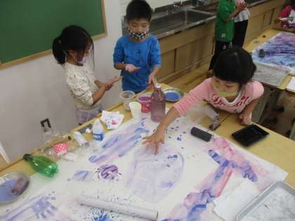 子ども達はとても楽しそうに絵の具を使って手形をぺたぺたつけたり、輪の形をつなげたりしていました。