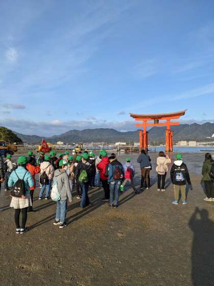 朝日に照らされた大鳥居の説明をガイドさんからうけています。
