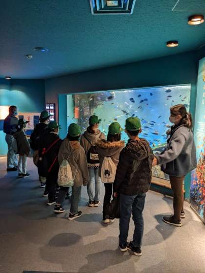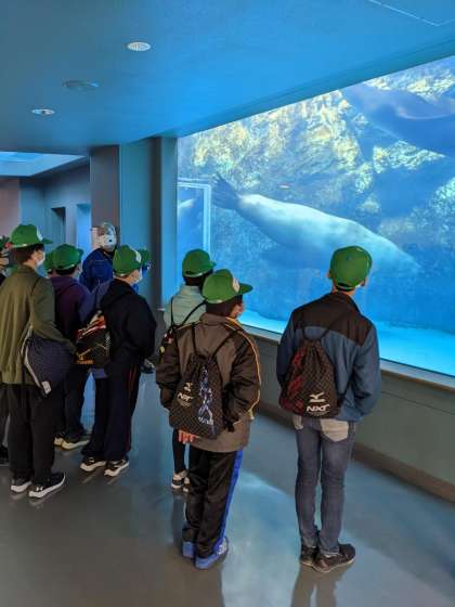 宮島水族館の見学が始まりました。ガイドさんの説明を聞きながら、見学しています。