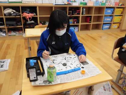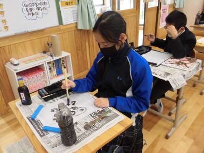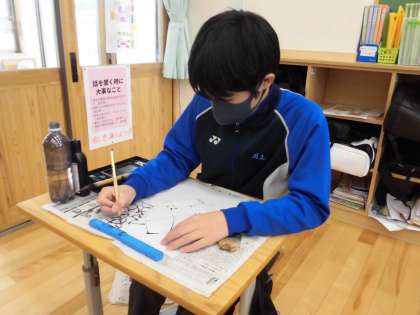 いろいろな濃さの墨を使って濃淡を表したり、「にじみ」「かすれ」「ぼかし」などの様々な技法を使ったりして、思い思いに描いていました。墨と水のつくる形や色の特徴をとらえることができ、一人一人表し方を工夫することができました。