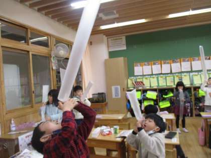 袋がふくらむ様子を見て、子ども達はいろいろなものを想像しています。