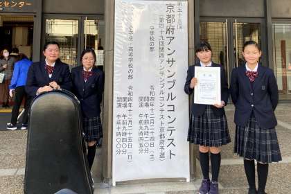 12月24日に行われた京都府アンサンブルコンテストに音楽部から金管4重奏で出場しました。結果は残念でしたが、この大会に向けて練習を重ねたことで確実に個々の技術が向上したと実感しています。今後も日々の練習を大切に良い演奏を聴いてもらえるように頑張ります。応援よろしくお願いします!