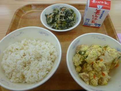 今日の献立は「ごはん・牛乳・厚あげの卵とじ・ほうれん草と切り干し大根のごま煮」です。厚あげの卵とじに使用した青ねぎは京北産の九条ねぎです。