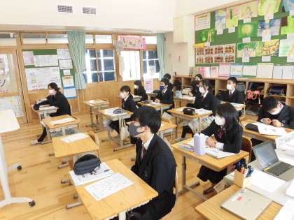 先日、栄養教諭の先生と、京都市の学校給食について学習をしました。普段食べている給食には、伏見とうがらしや賀茂なすなどの京野菜が多く使われていることや、季節ごとに旬の食材が使われていることを知りました。また、京北という地域の特性を生かした食材(京北米・みそ・地産地消)を食べていることにも気付くことができました。