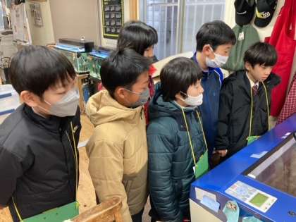 本日、京北ふるさと未来科の学習で井口木材さんへレーザー加工の見学、木工体験をさせていただきました。レーザー加工の機械が動いている様子を見て、「何度くらいの温度なんだろう?」「うわ、すごい、、、。」という子どもたちの声がありました。