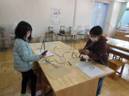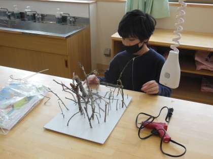 材料の木を組み合わせて、「ひみつのすみか」を作成しています。子どもたちは、「誰が住んでいるのか」「どんな物があるのか」などをイメージしながら自分だけのとっておきの「ひみつのすみか」を作っていきます。木と木を組み合わせる時には、グルーガンを使っています。最初と比べると使い慣れてきたようで、今では安全で上手に使うことができています。