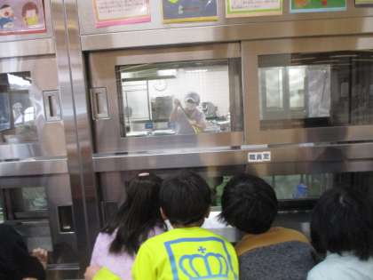 今日はランチルームに行って給食調理員さんのお仕事を実際に見ることにしました。