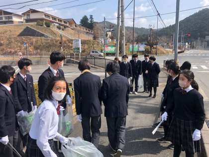 卒業を前に、日常からお世話になっている地域の方々への感謝の意を込めて、地域清掃活動を行いました。1から3組を2グループに分けて、学校から弓削川沿いの遊歩道を中心に、ゴミを拾い集めました。ぽかぽか陽気のもとで、生徒たちは汗ばみながらも熱心に取り組むことができました。9年生の卒業後には、弓削川沿いの桜が美しく咲き誇るでしょうね。