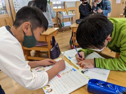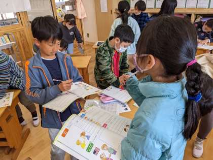 また、1回目の授業ということで、友だちともお互いにあいさつをし、相手の好きなものを伝え合いました。子どもたちは、外国語を使って伝え合う活動を通して、「もっといろいろな外国語を知りたい」「世界の人と繋がりたい」とふりかえりに書いていました。