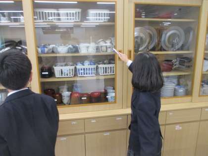 フライパンや鍋、茶わん、はしなど調理実習で使うものやテーブルの使い方を確認をしました。