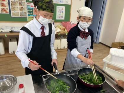 繊維を断つ切り方と繊維にそう切り方では食感も変わることに気付くことができ、「風味が違うな。」「食感がいいな。」という会話も聞こえてきました。また、班ごとに協力して、片付けまで素早く行うこともできました。