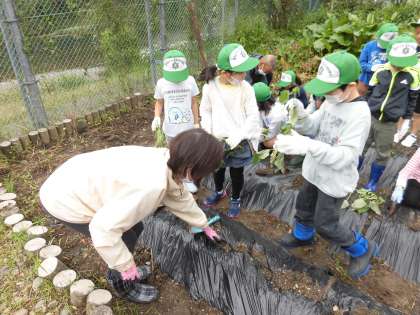 今日の1・2時間目に、京北サポート隊の方々から、さつまいもの苗の植え方を教えていただき、元京北第一小学校にある畑に苗を植えました。土を掘って苗を置き、その上からやさしく土をかけました。「大きくなあれ。」と願いを込めて、植えました。子どもたちは、早くさつまいもが収穫できることを楽しみにしていました。