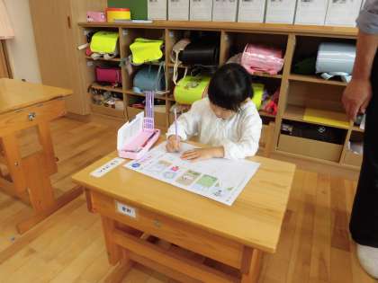 絵に合う言葉を考えて、丁寧に文字を書く練習をしました。子どもたちは、正しい姿勢を意識しながら、書くことができました。