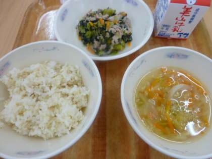 今日の献立は、ご飯・牛乳・豚肉と小松菜の梅炒め・キャベツのすまし汁
