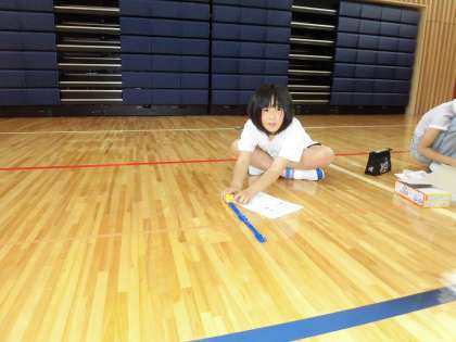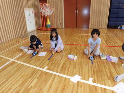 ゴムののばし方をかえると、ものの動き方はどのように変わるかを実験しました。ゴムののばし方を長くするほど、車の進む距離は長くなることが分かりました。「実験結果が予想通りだった!」という声が子どもたちからたくさん聞こえてきました。