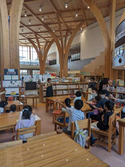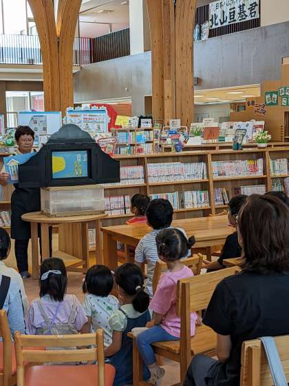「絵本大好き!図書館でいっしょに遊ぼう」が京都京北小中学校の学校図書館で行われています。絵本の読み聞かせに続いて、紙芝居です。双子座の物語を聞きました。
