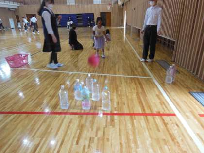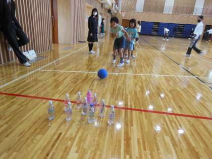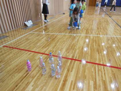 ボール遊びでは、サッカーとボーリングを楽しみました。ボーリングのグループは、ピンに見立てたペットボトルに向かってボールを転がしました。ペットボトルを多くに倒せるように頑張って転がしていました。