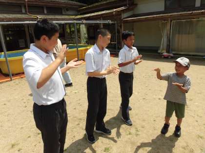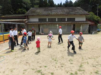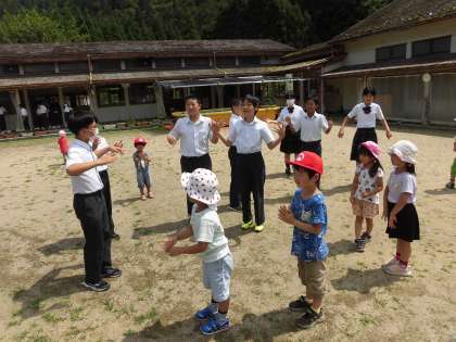 保育所の子どもたちと一緒に遊んでいる様子です。一緒に踊ったり、バナナおにやけいどろをしたりして遊びました。保育所の子どもたちも、この日を楽しみにしてくれていたみたいで、笑顔いっぱいでとても楽しそうでした。