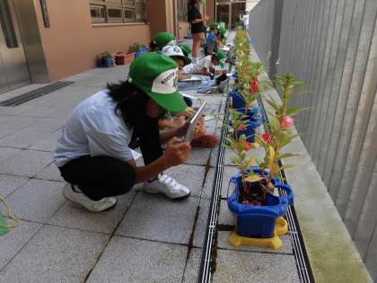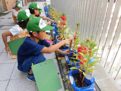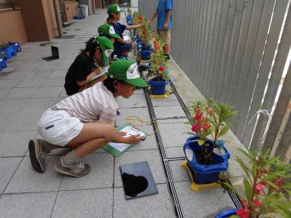ようやくホウセンカの花が咲き始めました。ホウセンカの成長の変化が後でも分かるように、タブレットで写真を撮っています。定規で高さを測ったり、タブレットで撮った写真に気付いたことを書いたりする子もいました。