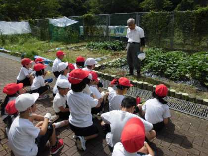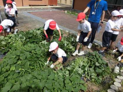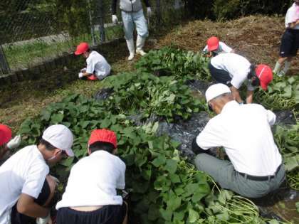 さつまいもの周りに草がたくさん生えていたので、さつまいもにしっかり栄養がいくように、いらない草を抜きました。子どもたちがしっかりと草を抜いてくれたので、とても綺麗になりました。また、お手伝いいただきました京北サポート隊の方々、大変お世話になり、ありがとうございました。