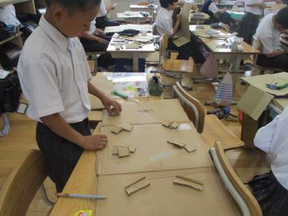 段ボールを使って、ビー玉を転がして遊ぶ仕掛けを作っています。