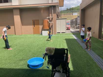 次は、水遊び。中庭をおもいっきり走りながら水鉄砲を楽しみました。
