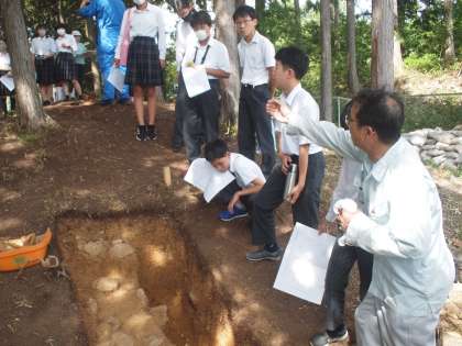 本校の敷地内にある「周山古墳群」について調査研究をされている、龍谷大学の先生と学生の方から調査内容についてくわしい説明を受けました。実際に発掘調査をされている現場でお話しを聞くことができ、生徒たちからも大学の先生方に数多く質問をするなど、考古学という学問にふれる良い機会になりました。今回出土した遺物や、過去にこの古墳から見つかった埴輪などは、この秋以降、旧第二小学校にある「京北文化遺産センター」で公開されるそうです。「この見学会を機会に、考古学に興味関心をもってくれたらとてもうれしいです。」と大学の先生方はおっしゃっていました。