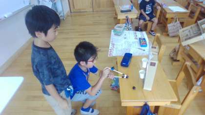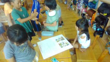 夏休みの自由課題の発表をしました。工作をしてきたり、絵を描いてきたりと楽しい作品がたくさん集まりました。子どもたちは、楽しそうに自分の作品を発表しあっていました。