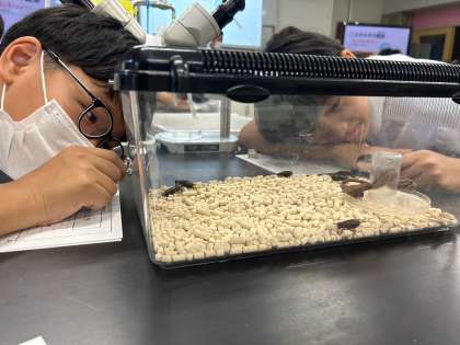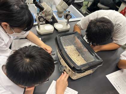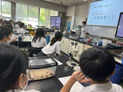 「なき虫」のヒミツの学習が始まりました。リーリーと鳴き声が教室で響いています。ルーペを使って観察をしています。