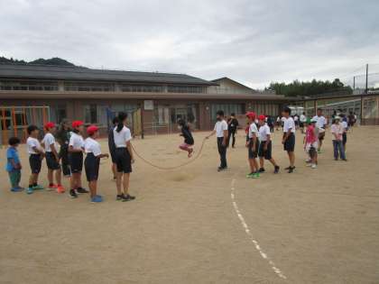 本日5校時に、生徒会主催の『京北全校遊び』が行われました。第1回目の今回は、8つの縦割り班で縄跳びの八の字跳びを楽しみました。高学年の生徒が、低学年の手を取りいっしょに跳んだり、タイミングを教えるなど、終始ほのぼのとした雰囲気で八の字跳びが行われました。生徒会役員の皆さん、企画や準備・片付け等お疲れさまでした。