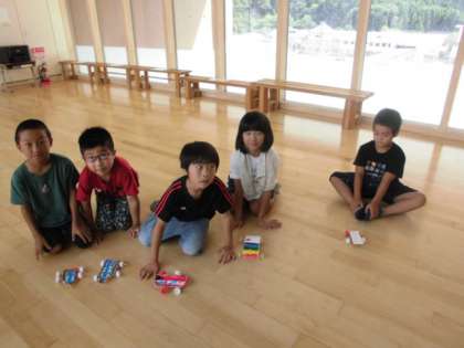 ふるさと未来科の学習で動くおもちゃ作りをしています。今回は、進むおもちゃを作りました。ペットボトルのキャップをタイヤにして、車や新幹線などを作りました。休み時間に、完成したおもちゃで遊んでいる子も多くいます。