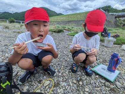 実際にゴリはどんな味がするのか、ゴリの佃煮を食べてみました。少し苦みがありますが、「ごはんと一緒に食べたい!」「もっと食べたい!」と子どもたちは大喜びで、おかわりをしている子がたくさんいました。