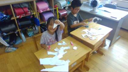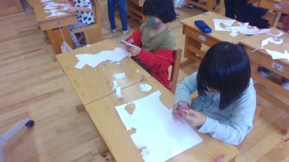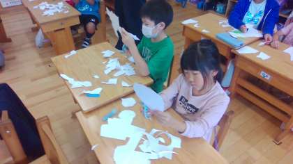 図画工作科の時間に、画用紙を切ってできた形から、何に見えるかを想像し、作品をつくる活動をしました。子どもたちは、互いに「魚かな。」「岩に見えるな。」など、いろいろ考えて題名をつけていました。