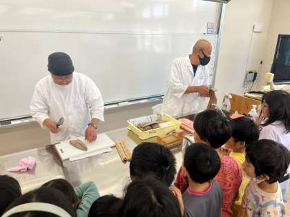 また、鯖寿司の作り方の実演を見せていただいたあとは、待ちに待った食味体験。今回、初めて鯖寿司を食べる子もいましたが、みんな口々に「すごくおいしい」と顔がほころんでいました。地域の特産品を学べる、とても良い機会となりました。
