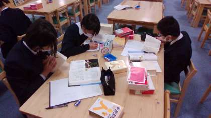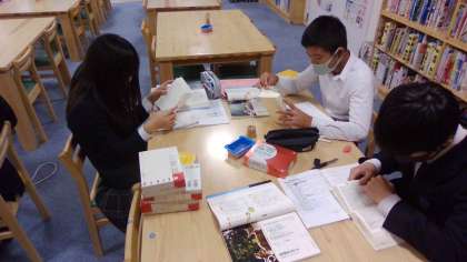 「漢字の音・訓」の単元では、辞書を使って学習をしました。漢字辞典と国語辞典を用途によって使い分けています。普段の生活でわからない言葉に出会ったときにそのままにしてしまっていたり、スマホやタブレットで調べたりすることが多いようで、辞書を引くことに慣れていない生徒が大勢いました。紙の辞書は探した語句の意味・用法・用例を一度に見渡すことができるだけでなく、調べたい語句のまわりにある語句の意味が目に入ることから、ほかの言葉や表現を知るきっかけにもなります。 このように「言葉との偶然の出会いがある」ので、じっくりと紙の辞書を引く時間を大切にしてほしいです。