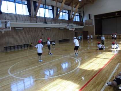 体育の時間に縄跳びをしています。駆け足とびやあやとびなどいろいろな跳び方に挑戦しています。